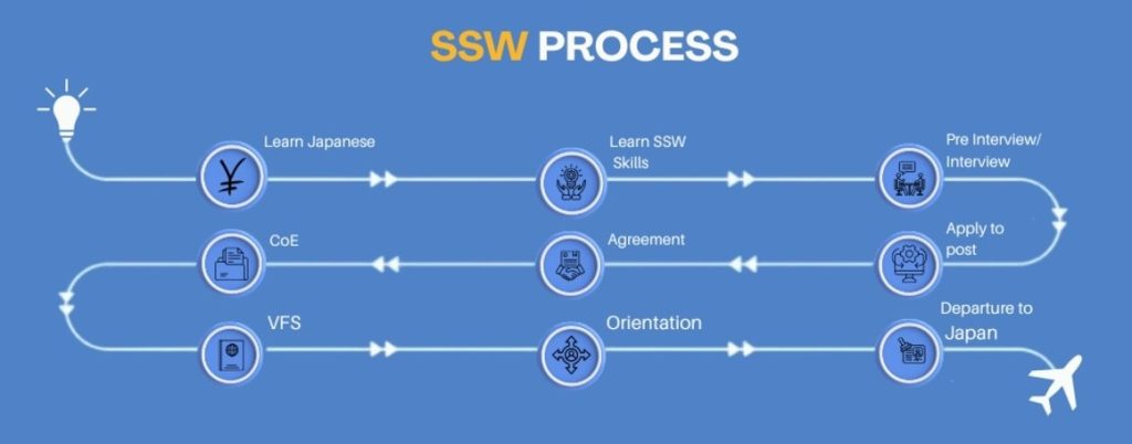 The Specified Skilled Worker (SSW) program was introduced by the Japanese government in 2019 to address labor shortages in key industries by hiring skilled foreign workers. It offers two visa types: SSW Type 1, which allows work in 14 industries for up to five years without family accompaniment, and SSW Type 2, which is for higher-skilled workers and allows long-term residence with family members.
